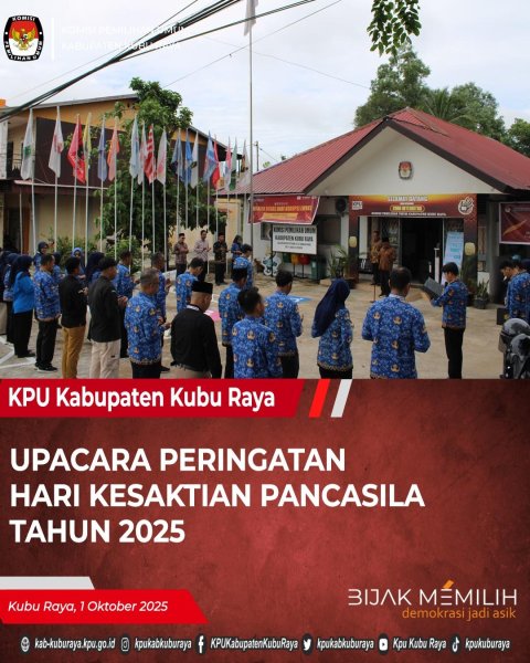 Kubu Raya – Jajaran Komisi Pemilihan Umum (KPU) Kabupaten Kubu Raya melaksanakan upacara bendera untuk memperingati Hari Kesaktian Pancasila, Rabu (1/10/2025). Hari Kesaktian Pancasila yang jatuh setiap 1 Oktober memiliki arti mendalam bagi bangsa Indonesia. Peringatan ini tidak hanya dimaknai sebagai rutinitas tahunan, melainkan juga sebagai pengingat akan perjalanan sejarah yang pernah menguji persatuan dan kesetiaan rakyat Indonesia pada ideologi negara. Sejarah mencatat, peristiwa Gerakan 30 September 1965 (G30S/PKI) menjadi latar penting lahirnya momentum ini. Upaya kudeta yang dilakukan PKI untuk menggantikan Pancasila dengan ideologi komunis akhirnya digagalkan oleh TNI bersama rakyat. Dalam tragedi tersebut, enam jenderal dan satu perwira TNI Angkatan Darat gugur sebagai martir yang kini dikenang sebagai Pahlawan Revolusi. Pasca peristiwa itu, pemerintah di bawah kepemimpinan Presiden Soeharto berhasil menumpas PKI beserta simpatisannya. Stabilitas negara kembali pulih, dan Pancasila tetap tegak sebagai dasar serta panduan kehidupan berbangsa. Bagi jajaran KPU Kubu Raya, peringatan tahun 2025 ini menjadi kesempatan untuk menegaskan komitmen menjaga serta mengamalkan nilai-nilai Pancasila. Nilai tersebut diyakini tetap relevan sebagai landasan kebersamaan, penguat persatuan, dan pedoman menjaga keutuhan Negara Kesatuan Republik Indonesia (NKRI). Dalam pembacaan ikrar, peserta upacara menyatakan tekad untuk menjadikan Pancasila sebagai sumber kekuatan dalam memperjuangkan kebenaran, menegakkan keadilan, serta merawat persatuan bangsa. (humas)
