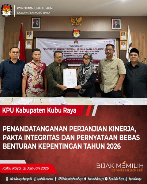 #PemilihBijak, Sebagai bentuk Komitmen untuk mencapai target kinerja, KPU Kabupaten Kubu Raya melakukan Penandatanganan Perjanjian Kinerja, Pakta Integritas, dan Pernyataan Bebas Benturan Kepentingan Tahun 2026, Rabu (21/1/2026).  Penandatangan dilakukan oleh Seluruh Pimpinan dan Pegawai KPU Kabupaten Kubu Raya di Aula Kantor KPU Kabupaten Kubu Raya. Melalui Komitmen tersebut, diharapkan dapat meningkatkan integritas, akuntabilitas, transparansi, dan kinerja lembaga KPU Kabupaten Kubu Raya sebagai Penyelenggara Pemilu.  #PemilihBijak #BijakMemilih #DemokrasiJadiAsik