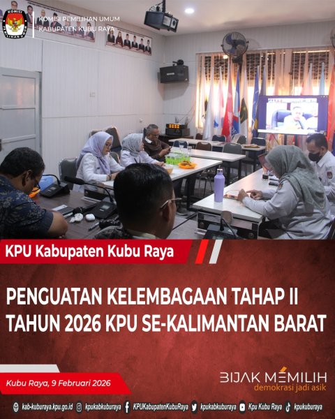 Kubu Raya– KPU Kabupaten Kubu Raya mengikuti kegiatan Penguatan Kapasitas Kelembagaan yang dihelat secara daring oleh KPU Provinsi Kalimantan Barat, Kamis (29/1/26). Forum yang diikuti seluruh komisioner dan jajaran sekretariat dari seluruh kabupaten/kota se-provinsi itu digelar sebagai wahana konsolidasi dan evaluasi kinerja. Ketua KPU Provinsi Kalimantan Barat, Muhammad Syarifuddin Budi, dalam arahan pembukaannya menegaskan bahwa kegiatan rutin bulanan ini bukan sekadar formalitas. Ia menyebutnya sebagai "upaya strategis untuk memastikan denyut nadi komunikasi dan koordinasi antar-lembaga penyelenggara pemilu di Kalbar tetap kuat dan seirama." "Pertemuan bulanan ini adalah amunisi kita. Tempat kita menyamakan persepsi, mengurai kendala, dan memperkuat soliditas kelembagaan, terutama dalam menyongsong tahapan pemilu yang akan datang," kata Syarifuddin, menekankan pentingnya forum tersebut sebagai sarana menjaga kualitas penyelenggaraan pemilu yang berintegritas. "Intensitas komunikasi melalui forum ini diharapkan dapat meminimalisir kesenjangan informasi dan mempercepat respons atas berbagai tantangan di lapangan," pungkas Syarifuddin, menutup arahan. (humas)