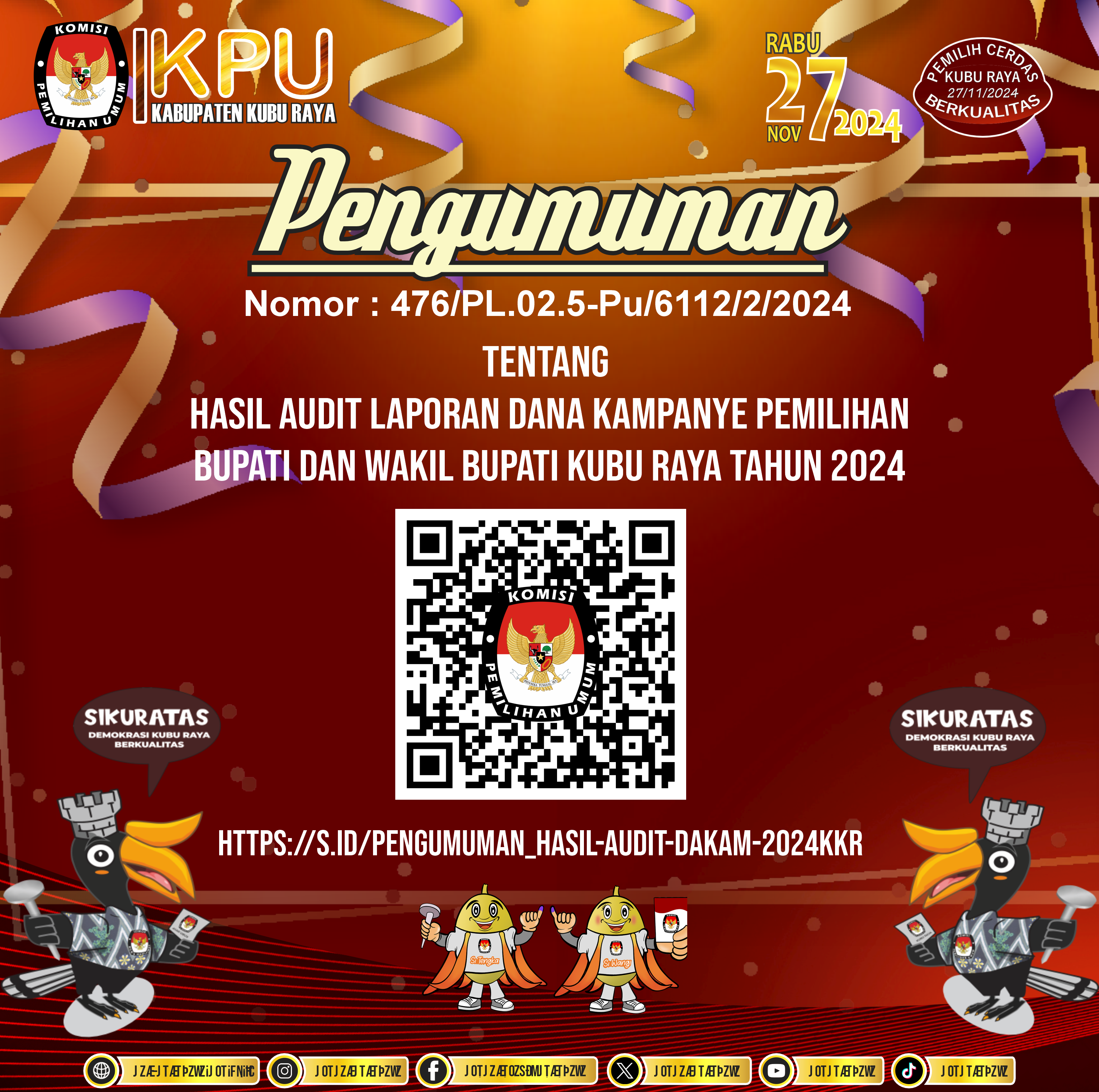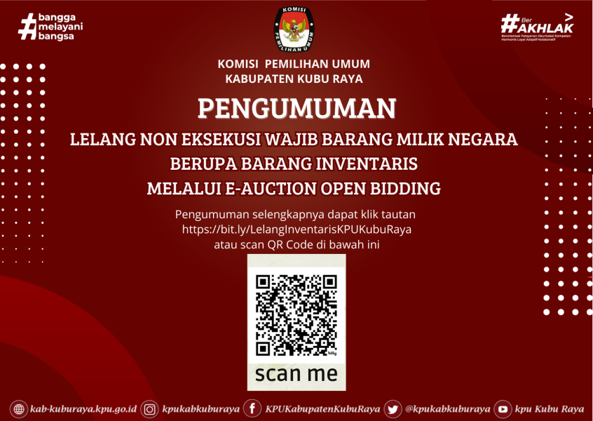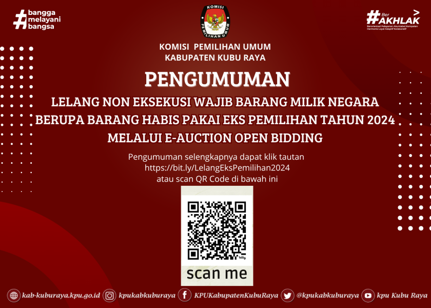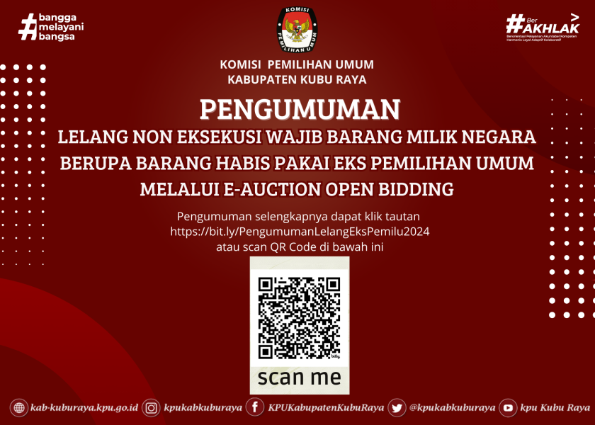 #TemanPemilih, Berikut Pengumuman Lelang Non Eksekusi Wajib Barang Milik Negara Berupa Barang Habis Pakai Eks Pemilihan Umum melalui E-Auction Open Bidding.  Pengumuman selengkapnya dapat klik tautan https://bit.ly/PengumumanLelangEksPemilu2024 atau scan QR Code.  ​​​​​​​ #KPUMelayani #KPUKabKubuRaya