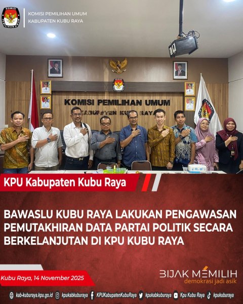 Kubu Raya — Badan Pengawas Pemilihan Umum (Bawaslu) Kabupaten Kubu Raya melaksanakan kegiatan Pengawasan Pemutakhiran Data Partai Politik secara berkelanjutan di Kantor Komisi Pemilihan Umum (KPU) Kabupaten Kubu Raya, Jumat 14 November 2025. Kegiatan ini dihadiri oleh Ketua Bawaslu Kabupaten Kubu Raya beserta jajaran, Ketua dan Anggota KPU Kabupaten Kubu Raya, serta Jajaran Sekretariat KPU Kabupaten Kubu Raya.