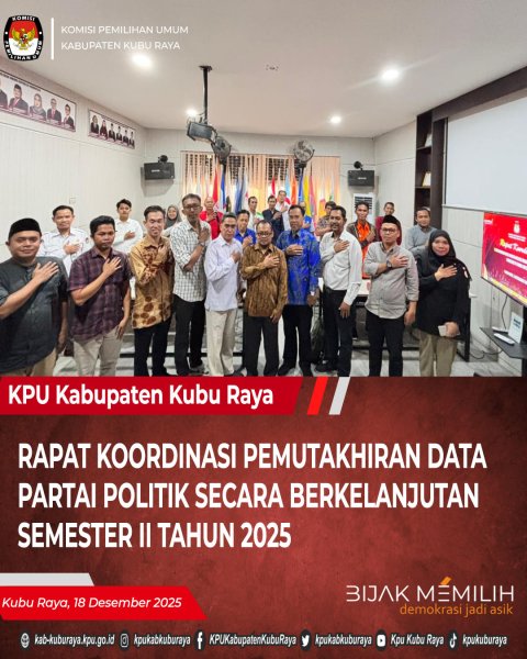 Kubu Raya — Komisi Pemilihan Umum (KPU) Kabupaten Kubu Raya terus memperkuat akurasi dan pemutakhiran data partai politik melalui Rapat Koordinasi Pemutakhiran Data Partai Politik Secara Berkelanjutan Semester II Tahun 2025. Kegiatan tersebut digelar di Aula Pertemuan KPU Kabupaten Kubu Raya, Kamis (18/12/2025).