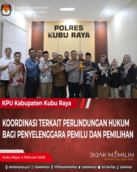 KUBU RAYA, — Komisi Pemilihan Umum (KPU) Kabupaten Kubu Raya hari ini (5/02/2026) memperkuat sinergi dengan Kepolisian Resor Kubu Raya guna membangun kesepahaman serta perlindungan hukum bagi penyelenggara pemilu. Langkah ini ditempuh sebagai upaya evaluasi pelaksanaan Pemilu dan Pemilihan 2024 sebagai upaya menghadirkan penyelenggaraan Pemilu 2029 lebih berintegritas dan akuntabel.