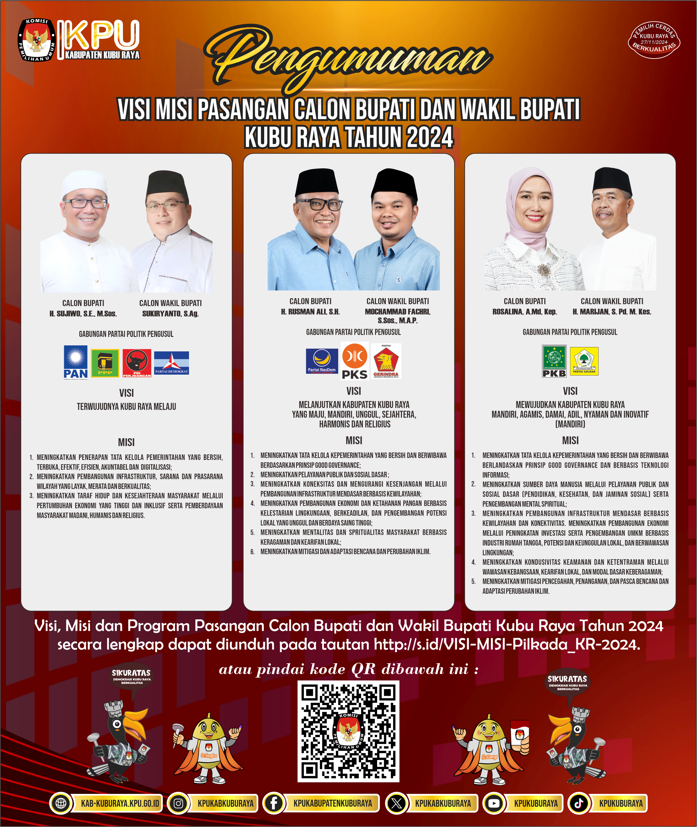 Visi, Misi dan Program Pasangan Calon Bupati dan Wakil Bupati Kubu Raya Tahun 2024 secara lengkap dapat diunduh pada tautan http://s.id/VISI-MISI-Pilkada_KR-2024.