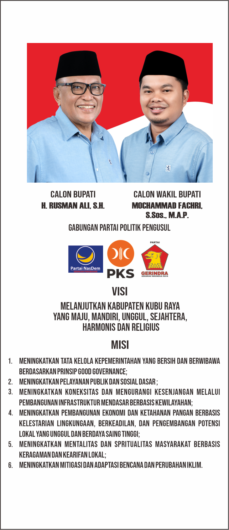 Visi Misi H. Rusman Ali, S.H. dan Mochammad Fachri, S.Sos., M.A.P. Minggu, 15 September 2024 20:00 115 Visi Misi dan Program Pasangan Calon selengkapnya download disini Bagikan: Telah dilihat 115 kali