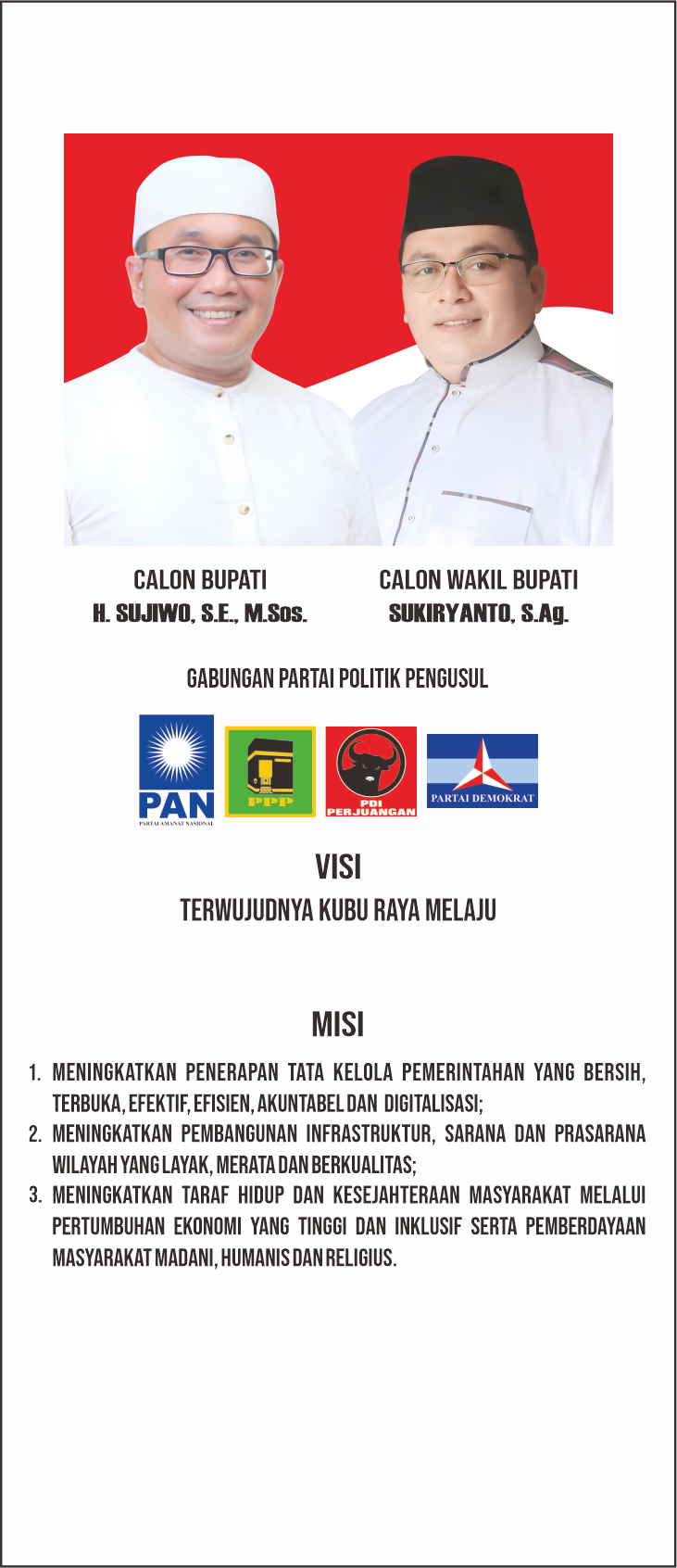 Visi Misi H. Sujiwo, SE., M.Sos. dan Sukiryanto, S.Ag. Minggu, 15 September 2024 20:00 174 Visi Misi dan Program Pasangan Calon selengkapnya download disini Bagikan: Telah dilihat 174 kali