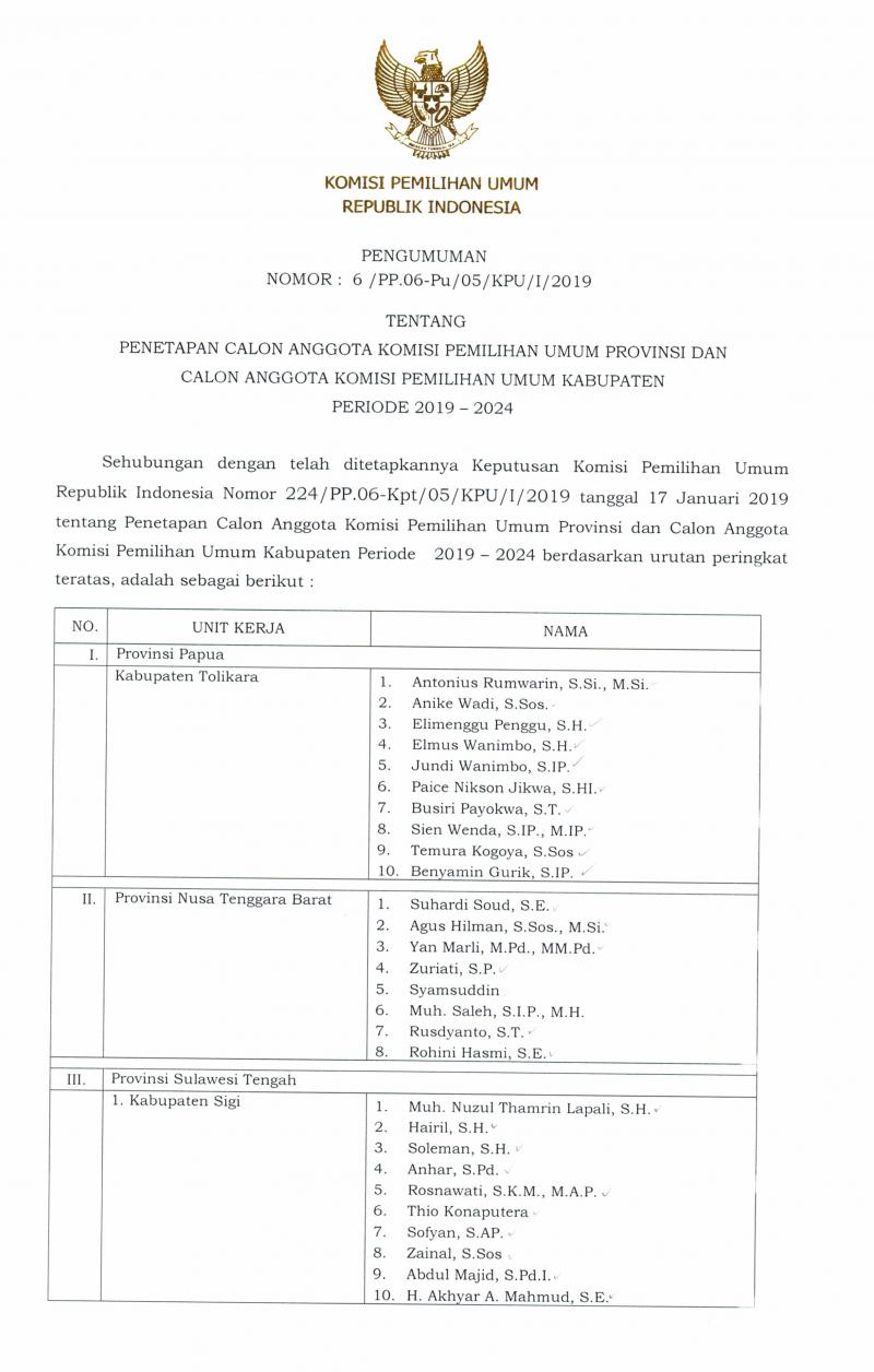 Pengumuman Penetapan Calon Anggota KPU Kabupaten/Kota Untuk Periode 2019-2024 Selamat kepada 5 besar yang sudah terpilih menjadi Anggota Kpu Kabupaten Kubu Raya,