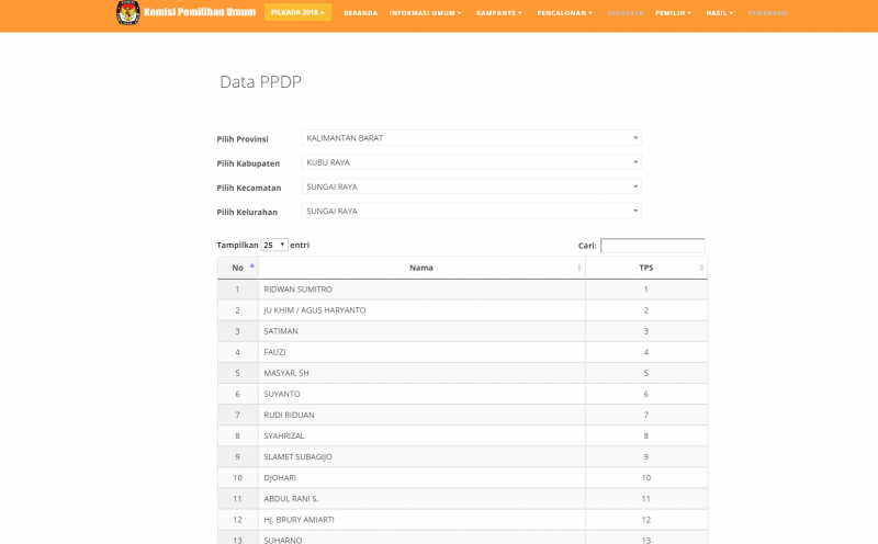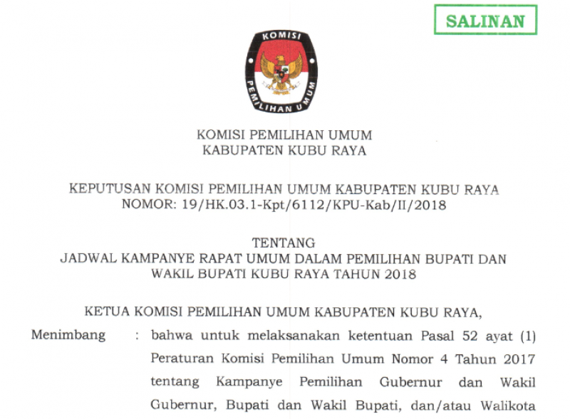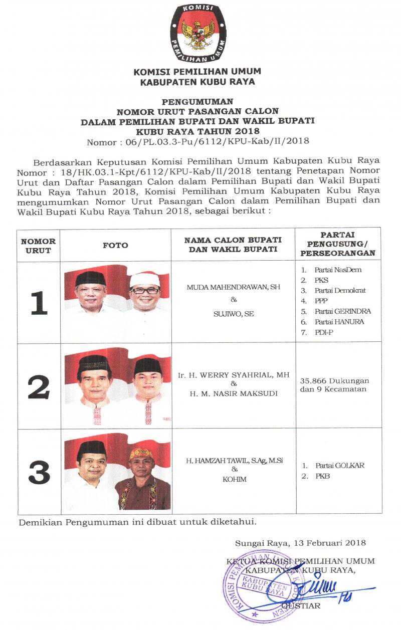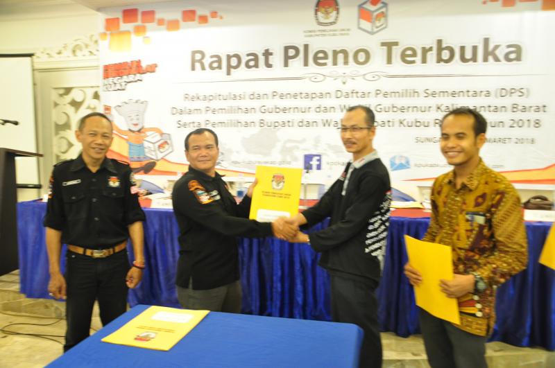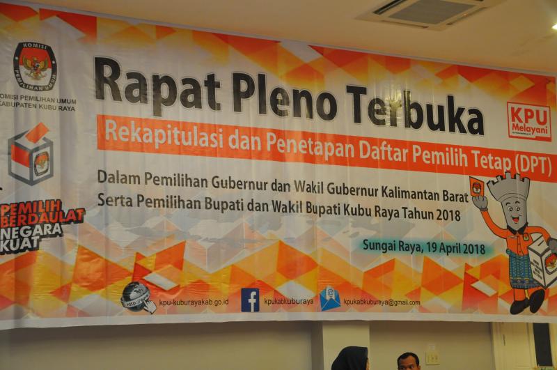 Kubu Raya- Komisi Pemilihan Umum (KPU) Kabupaten Kubu Raya melaksanakan kegiatan Rapat Pleno Terbuka Rekapitulasi dan penetapan Daftar Pemilih sementara (DPS) dalam Pemilihan Gubernur dan Wakil Gubernur Kalimantan Barat serta Pemilihan Bupati dan Wakil Bupati Kubu Raya Tahun 2018. Acara dilaksanakan Jum’at, pada 16 Maret 2018, pukul 14.00 Wib. Yang dibuka oleh Ketua KPU Kabupaten Kubu Raya, Gustiar, S.pd.I. Acara dihadiri oleh Panwas Kabupaten Kubu Raya yang di wakili oleh Ahmad Darwis (Ketua) dan U. Juliadi Asyah dan Kamaruzaman (Anggota), Polresta Pontianak yang diwakili oleh Slamet Suyoto (Kathum), Polres Mempawah yang diwakili oleh Sumarno(KBO Intel) dan Firmansyah (LO RES), Kesbangpol Kabupaten Kubu Raya yang diwakili oleh Hakiman (Kakan Kesbangpol) dan Syaparudin (Kasi Kawasdin), Dinas Dukcapil Kabupaten kubu raya yang diwakili oleh Jamli (Kabid) dan Vebri Firmansyah (Operator), serta di hadiri para LO Paslon Gubernur dan Wakil Gubernur Kalimantan Barat serta LO Bupati dan Wakil Bupati Kubu Raya. Hasil dari Rekapitulasi Pemilih yang terdaftar di setiap Kecamatan yaitu Kecamatan Sungai Raya (L) 73.794 (P) 73.041 Kecamatan Kuala Mandor B (L) 9.887 (P) 9.727 Kecamatan Sungai Ambawang (L) 28.745 (P) 27.420 Kecamatan Terentang (L) 4.340 (P) 4.038 Kecamatan Batu Ampar (L) 13.011 (P) 12.160 Kecamatan Kubu (L) 15.746 (P) 15.106 Kecamatan Rasau Jaya (L) 9.804 (P) 9.621 Kecamatan Teluk Pekedai (L) 7.202 (P) 6.937 Kecamatan Sungai Kakap (L) 39.723 (P) 39.051. total jumlah DPS Kabupaten Kubu Raya dalam Pemilukada serentak 2018 berjumlah 399.353 pemilih.