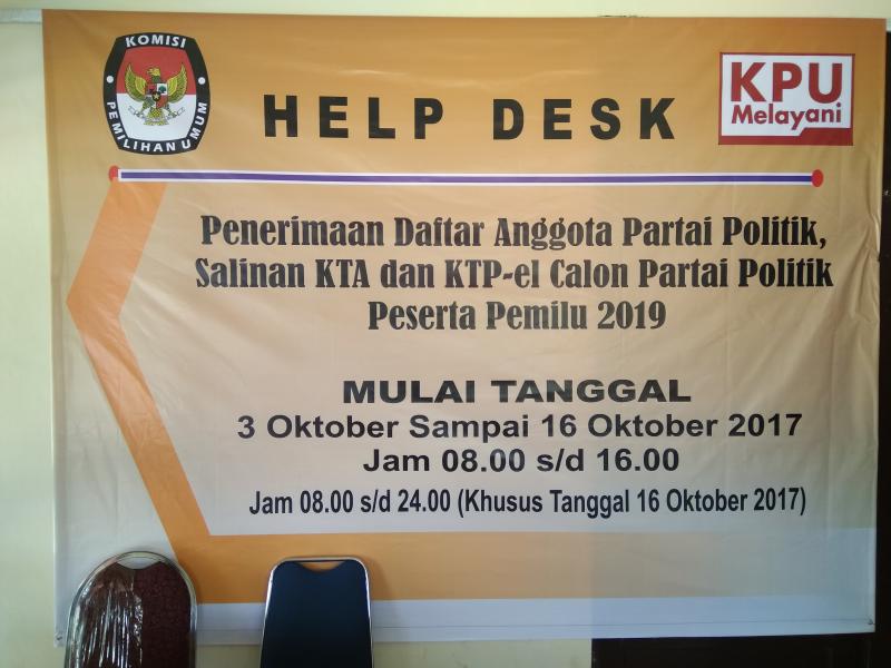 kpu-kuburayakab.go.id-Komisi Pemilihan Umum (KPU) Kabupaten Kubu Raya membuka pendaftaran partai politik (parpol) calon peserta Pemilu Serentak Tahun 2019. Selama 14 hari kalender, yaitu tanggal 3 s/d 16 Oktober 2017. Pada hari ke-1 sampai hari ke-13 pendaftaran dibuka pukul 08.00 s/d 16.00 WIB, sedangkan hari ke-14 atau hari terakhir pukul 08.00 s/d 24.00 WIB.