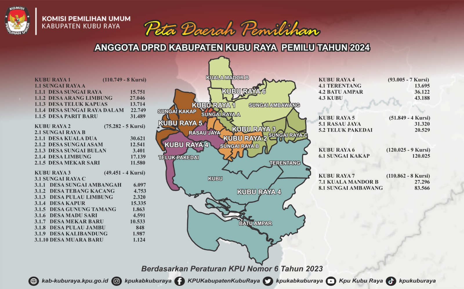 KUBU RAYA - Komisi Pemilihan Umum Republik Indonesia (KPU RI) telah mengeluarkan Peraturan KPU RI Nomor 6 Tahun 2023, tentang Daerah Pemilihan dan Alokasi Kursi Anggota Dewan Perwakilan Rakyat (DPR), Dewan Perwakilan Rakyat Daerah (DPRD) Provinsi dan Dewan Perwakilan Rakyat Daerah (DPRD) Kabupaten/Kota dalam Pemilihan Umum tahun 2024.