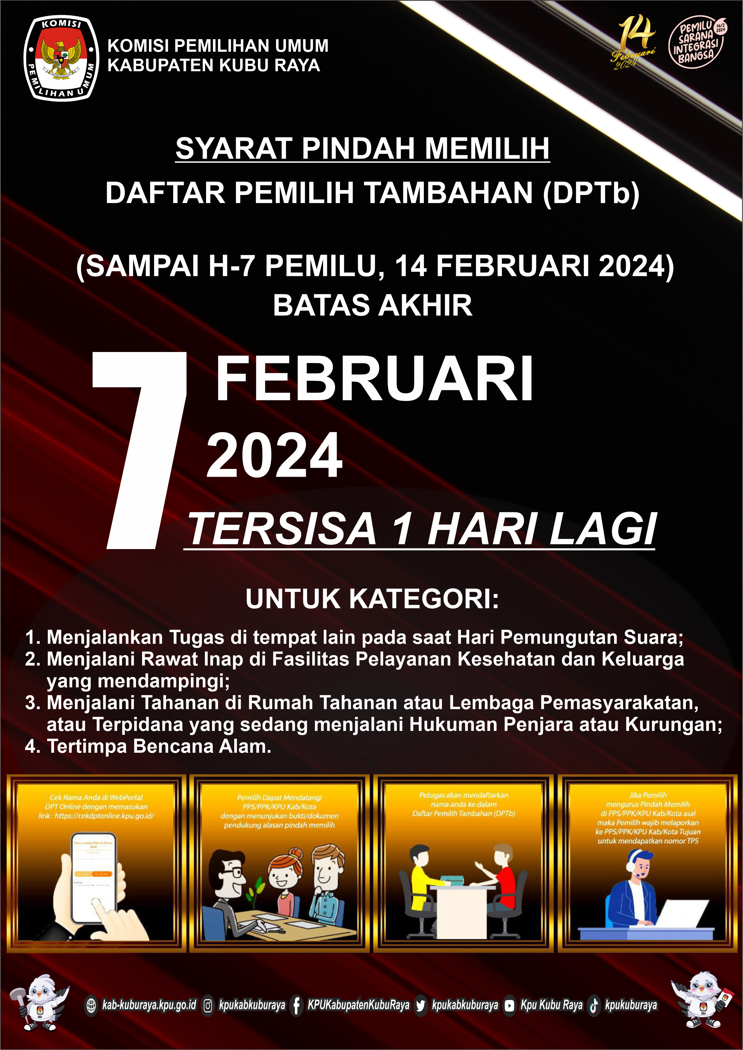 Berdasarkan PENGUMUMAN KPU Kabupaten Kubu Raya Nomor 271/PL.01.3-PU/6112/2022 telah mengumumkan dan menerima masukan masyarakat secara langsung maupun melalui proses uji publik, terutama pemerintah Daerah dan juga Partai Politik di Kabupaten Kubu Raya sebagai peserta Pemilu kedepan.