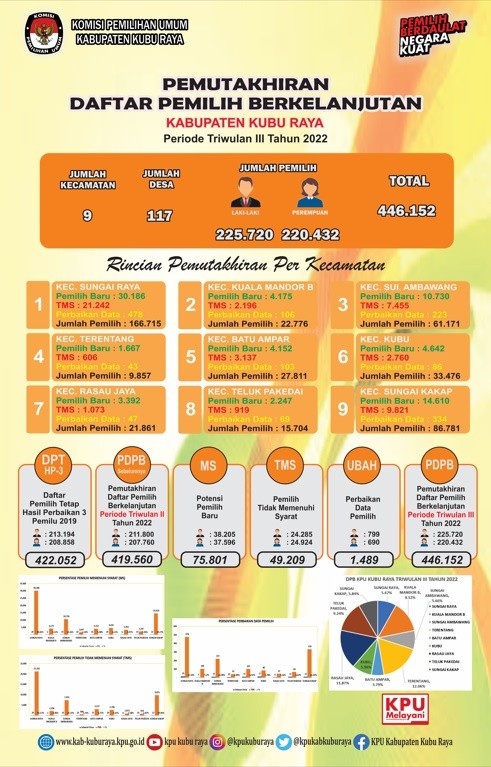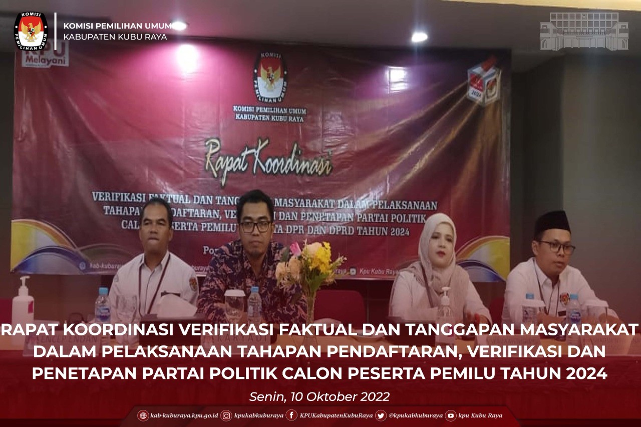 KPU Kabupaten Kubu Raya menggelar Rapat Koordinasi Verifikasi Faktual dan Tanggapan Masyarakat dalam Pelaksanaan Tahapan Pendaftaran, Verifikasi dan Penetapan Partai Politik Calon Peserta Pemilu Anggota DPR dan DPRD Tahun 2024, Senin (10/10). Kegiatan yang digelar di Hotel Orchardz Jalan Perdana Pontianak turut dihadiri oleh Perwakilan dari Dandim 1207 Pontianak, Kapolres Kubu Raya, Kepala Dinas PMD Kabupaten Kubu Raya, Kepala BKPSDM Kabupaten Kubu Raya, Kepala Badan Kesbangpol Kabupaten Kubu Raya, Kepala Dinas Dukcapil Kabupaten Kubu Raya, Kasat Pol PP Kabupaten Kubu Raya, Kabag Pemerintahan Sekretariat Daerah Kabupaten Kubu Raya, Ketua Bawaslu Kabupaten Kubu Raya, Camat Sungai Raya, Ketua dan Petugas Penghubung Partai Politik Calon Peserta Pemilu Tahun 2024 di Tingkat Kabupaten Kubu Raya, serta Media Massa di Kalimantan Barat. Kegiatan dimulai pada pukul 14.38 WIB oleh MC dengan diawali Pembacaan Doa, Menyanyikan Lagu Indonesia Raya dan Pembacaan Laporan Kegiatan oleh Kepala Subbagian Teknis Penyelenggaraan Pemilu, Partisipasi dan Hubungan Masyarakat KPU Kabupaten Kubu Raya Rajemi. Laporan Kegiatan yang disampaikan menyebutkan dasar hukum diselenggarakannya kegiatan tersebut beserta peserta yang dihadirkan dalam kegiatan. Setelah pembacaan Laporan Kegiatan, kegiatan secara resmi dibuka dengan sambutan yang disampaikan oleh Ketua KPU Kabupaten Kubu Raya Karyadi. Karyadi menjelaskan bahwa tujuan diselenggarakannya rakor agar masyarakat mengetahui bahwa Tahapan Pemilu sudah dimulai. “Mulai dari tanggal 1 sampai 14 Agustus merupakan masa pendaftaran partai politik calon peserta Pemilu Tahun 2024. Di Kubu Raya sendiri ada 23 Partai Politik yang lolos dan masuk ke dalam Tahap Verifikasi Administrasi” jelasnya. Sebagaimana dituangkan dalam PKPU Nomor 4 Tahun 2022, Tanggal 14 Oktober 2022 akan diumumkan Partai Politik yang akan dilanjutkan Verifikasi Faktual. Namun berdasarkan Putusan MK 55/PUU-XVIII/2020, Partai Politik dalam Parlemen atau Partai Politik yang melampaui ambang batas pada Pemilu Tahun 2019 tidak dilakukan proses Verifikasi Faktual. Terkait Tanggapan Masyarakat yang diterima oleh KPU Kabupaten Kubu Raya, Karyadi menyampaikan bahwa Tanggapan Masyarakat yang diterima tersebut sudah dilakukan Klarifikasi ke Partai Politik dan khusus ASN/TNI/Polri yang melaporkan tanggapan masyarakat akan diklarifikasikan juga ke instansi terkait. “Semoga pada saat Pengumuman Penetapan Partai Politik, sudah tidak ada ASN/TNI/Polri yang terdaftar di keanggotaan Partai Politik” harapnya. Karyadi juga menyampaikan bahwa KPU membutuhkan dukungan dari semua pihak. “KPU butuh dukungan dari semua lapisan masyarakat untuk mensukseskan Pemilu Tahun 2024” jelasnya. Setelah dibuka secara resmi oleh Ketua KPU Kabupaten Kubu Raya Karyadi, kegiatan dilanjutkan dengan penyampaian materi oleh Encep Endan selaku Anggota KPU Kabupaten Kubu Raya Divisi Teknis Penyelenggaraan dan Ahmad Darwis selaku Anggota Bawaslu Kabupaten Kubu Raya Divisi Sengketa. Materi yang disampaikan Encep Endan berkaitan dengan Tatacara Verifikasi Faktual Kepengurusan dan Keanggotaan Partai Politik dan Mekanisme Penyampaian Masyarakat dalam Pelaksanaan Tahapan Pendaftaran, Verifikasi dan Penetapan Partai Politik Calon Peserta Pemilu Tahun 2024 di Kabupaten Kubu Raya. Dalam kesempatannya, Encep Endan menjelaskan mulai dari dasar hukum, alur proses, jadwal dan program, hingga mekanisme secara rinci dalam proses verifikasi faktual dan tanggapan masyarakat. Encep Endan menyampaikan juga tatacara penentuan sampling dalam proses Verifikasi Faktual. “Ada rumus Krejcie Morgan yang digunakan dalam menentukan Sampling Verifikasi Faktual Keanggotaan Parpol. Apabila Populasi anggota parpol semakin tinggi, maka sampling akan semakin tinggi juga” ujarnya. Dalam pelaksanaan verifikasi faktual keanggotaan partai politik, banyak kondisi-kondisi yang perlu dipahami seperti tidak adanya identitas anggota partai politik, adanya anggota partai politik yang menyatakan bukan anggota partai politik, adanya anggota partai politik yang telah mengundurkan diri atau meninggal dunia, hingga adanya anggota partai politik yang tidak berada di tempat tingggal saat verifikasi faktual berlangsung serta tidak dapat dihadirkan di kantor tetap partai politik. Melihat dari kondisi tersebut, dibutuhkan banyak persiapan dalam pelaksanaan verifikasi faktual kepengurusan, kantor tetap dan keanggotaan partai politik. Selanjutnya materi kedua dengan tema Mekanisme dan Penguatan Pengawasan Tahapan Pendaftaran, Verifikasi dan Penetapan Partai Politik Calon Peserta Pemilu Anggota DPR dan DPRD Tahun 2024 di Kabupaten Kubu Raya disampaikan oleh Ahmad Darwis selaku Anggota Bawaslu Kabupaten Kubu Raya Divisi Sengketa. Ahmad Darwis menyebutkan bahwa Bawaslu Kabupaten Kubu Raya melakukan pengawasan verifikasi mulai dari pengawasan verifikasi admistrasi keanggotaan partai politik hingga verifikasi faktual keanggotaan dan kepengurusan partai politik. Dalam pengawasan verifikasi faktual keanggotaan partai politik, Ahmad Darwis menyampaikan bahwa pengawasan tersebut dilakukan guna memastikan keberadaan keanggotaan partai politik, serta memastikan kesesuaian dan keabsahan dokumen atau identitas keanggotaan partai politik. Pada akhir materinya, Ahmad Darwis membacakan Laporan Aduan Masyarakat yang diterima oleh Bawaslu Kabupaten Kubu Raya. “Ada 81 orang yang berstatus ASN yang melaporkan dirinya dicatut oleh Partai Politik dan 28 orang lainnya, sehingga total aduan masyarakat mencapai 109 orang” ucapnya. Ahmad Darwis menyebutkan juga nama-nama partai politik yang mencatut nama Masyarakat yang melapor ke Bawaslu Kabupaten Kubu Raya tersebar pada 25 partai politik. Berkaitan dengan Aduan Masyarakat tersebut, Ahmad Darwis menyampaikan bahwa Bawaslu Kabupaten Kubu Raya telah menyampaikan Dokumen Aduan Masyarakat ke KPU Kabupaten Kubu Raya untuk ditindaklanjuti. Setelah pemaparan materi oleh narasumber, kegiatan dilanjutkan dengan sesi tanya jawab. Pertanyaan-pertanyaan yang dilontarkan