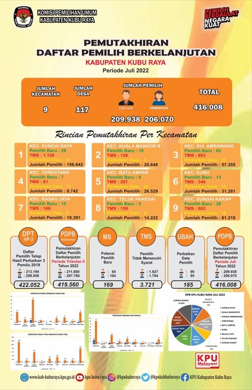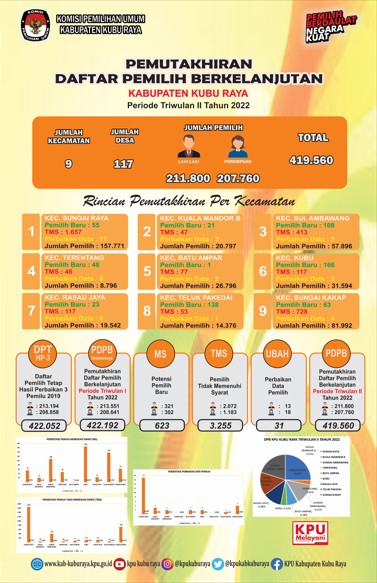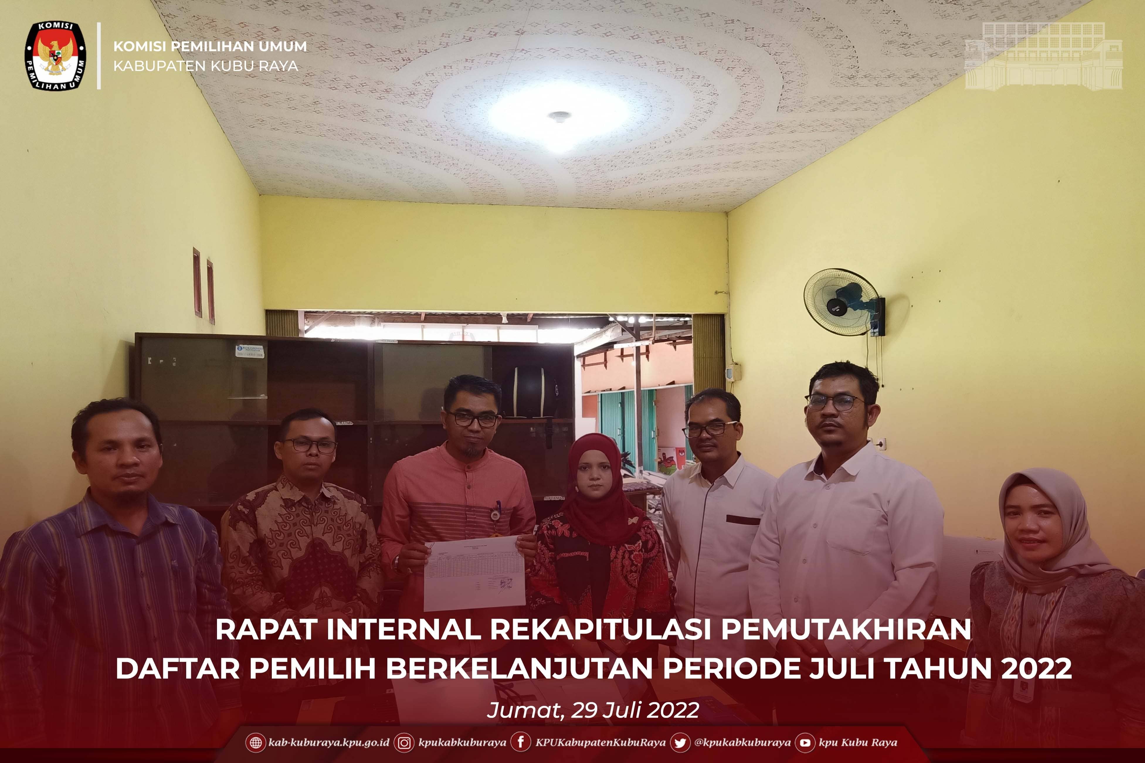 KPU Kabupaten Kubu Raya melaksanakan Rapat Internal Rekapitulasi Daftar Pemilih Berkelanjutan Periode Februari Tahun 2022, Jumat (29/7). Kegiatan yang diselenggarakan di Kantor KPU Kabupaten Kubu Raya pada pelaksanaannya ini didasarkan pada Peraturan Komisi Pemilihan Umum Republik Indonesia Nomor 6 Tahun 2021 tentang Pemutakhiran Data Pemilih Berkelanjutan. Rapat Internal yang dipimpin oleh Ketua KPU Kabupaten Kubu Raya Karyadi dimulai pada pukul 10.00 WIB. Rapat tersebut turut diikuti oleh Anggota KPU Kabupaten Kubu Raya, Sekretaris KPU Kabupaten Kubu Raya, Kepala Sub Bagian KPU Kabupaten Kubu dan Staf di Lingkungan Sekretariat KPU Kabupaten Kubu Raya. Dalam sambutannya, Karyadi berpesan agar data yang disampaikan dalam rapat sudah bersih dalam sinkronisasi data pemilih. Mulai memasuki proses Tahapan Pendaftaran dan Verifikasi Partai Politik Peserta Pemilu, Karyadi berpesan agar Tahapan Verifikasi Administrasi yang melibatkan bagian data perlu untuk saling memberikan dukungan. Untuk mengantisipasi kesalahan, Karyadi mengingatkan untuk berhati-hati dalam menyandingkan dan mengeksekusi data. “Tentu untuk data pemilih berkelanjutan maka perlu kehati-hatian dalam menyandingkan dan mengeksekusi data, data yang dieksekusi perlu untuk diketahui darimana sumber data tersebut didapatkan” ucapnya. Kemudian Anggota KPU Kabupaten Kubu Raya Divisi Perencanaan, Data dan Informasi Ahmad Fauzi mengingatkan bahwa perjalanan data perlu untuk dapat diketahui oleh semua pegawai KPU Kabupaten Kubu Raya. “Jika ada kesalahan dapat untuk saling mengingatkan dan saling memberikan masukan untuk mengatasi problematika yang ada dalam lembaga KPU Kabupaten Kubu Raya” ujarnya. Dalam kesempatannya, Ahmad Fauzi memaparkan Rekapitulasi Pemutakhiran DPB Periode Juli Tahun 2022. “Terdapat penambahan kategori pemilih baru sebanyak 169 pemilih yang berasal dari pemilih pindah masuk dari data pilkades yang ada di 8 kecamatan” ucapnya. Total Rekapitulasi Pemutakhiran DPB Periode Juli Tahun 2022 adalah sebanyak 416.008 pemilih yang tersebar di 9 kecamatan dan 117 desa. Total Rekapitulasi Pemutakhiran DPB Periode Juli Tahun 2022 tersebut turun sebanyak 3.552 pemilih dibanding Pemutakhiran DPB Periode sebelumnya. Menanggapi proses pemutakhiran DPB tersebut, Anggota KPU Kabupaten Kubu Raya Divisi Teknis Penyelenggaraan Encep Endan berharap agar data pemilih dapat dilakukan update secara rutin untuk membantu proses verifikasi partai politik. “Anggota partai politik wajib terdaftar sebagai data pemilih dalam DPB, data anggota partai politik yang tidak terdaftar dalam DPB perlu dilakukan pengecekan ke Dinas Dukcapil” jelasnya. Pelaksanaan Rapat Internal Rekapitulasi Pemutakhiran DPB Periode Juli Tahun 2022 ditutup oleh Ketua KPU Kabupaten Kubu Raya pada pukul 11.30 WIB. (Yat)