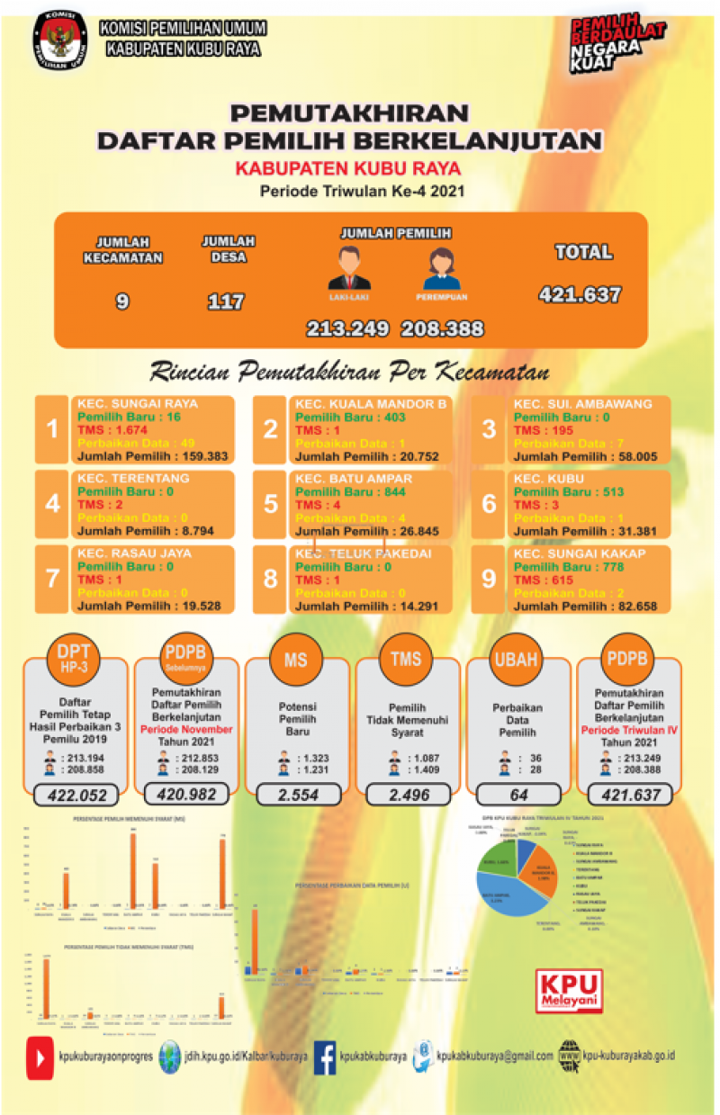 KPU Kabupaten Kubu Raya mengadakan kunjungan ke Dinas Pemberdayaan Masyarakat dan Desa (PMD) Kabupaten Kubu Raya di Sungai Raya (4/2). Dalam kunjungan tersebut KPU Kabupaten Kubu Raya dipimpin oleh Encep Endan dan Syaiful Maulana yang didampingi oleh Sekretaris, Kasubag Tekmas dan dua orang staf KPU Kabupaten Kubu Raya. Tiba di kantor Dinas PMD Kabupaten Kubu Raya, rombongan KPU Kabupaten Kubu Raya diterima langsung oleh Kepala Dinas PMD Kabupaten Kubu Raya Jakariansyah yang didampingi oleh Sekretaris dan dua orang Kepala Bidang dilingkungan Dinas PMD Kabupaten Kubu Raya. Dalam kesempatan tersebut, Encep Endan menyampaikan agenda kedatangan pihaknya ke Kantor Dinas PMD Kabupaten Kubu Raya yaitu bahwa berdasarkan ketentuan Pasal 7 ayat (2) Peraturan KPU Nomor 6 Tahun 2021 tentang Pemutakhiran Data Pemilih Berkelanjutan KPU Kabupaten/Kota diamanatkan untuk membentuk forum koordinasi tingkat Kabupaten / Kota yang melibatkan stakeholder diantaranya adalah Rukun Tetangga / Rukun Warga atau sebutan lain, sehubungan dengan hal tersebut maka KPU Kabupaten Kubu Raya merasa perlu melakukan koordinasi dengan Dinas PMD Kabupaten Kubu Raya guna mencari informasi tentang data RT/RW di Kabupaten Kubu Raya, termasuk data dan kontak person seluruh Kades di Kabupaten Kubu Raya serta asosiasinya jika memang RT/RW tersebut memiliki asosiasi. Sementara itu Syaiful Maulana menambahkan bahwa Pemutakhiran Data Pemilih Berkelanjutan yang dilakukan secara periodik setiap bulan oleh KPU beberapa tahun belakangan, bertujuan untuk menciptakan Daftar Pemilih yang akurat dan akuntabel menuju Pemilu Serentak 2024. Ia juga mengatakan bahwa semangat PKPU 6 Tahun 2021 ini adalah supaya dalam proses pemutakhiran data pemilih yang akan datang KPU lebih inklusif dengan melibatkan seluruh pemangku kepentingan seperti RT dan RW yang dianggap memiliki informasi tentang penduduk diwilayahnya. Menanggapi hal tersebut, Kepala Dinas PMD Kabupaten Kubu Raya Jakariansyah mengatakan bahwa pihaknya siap mendukung kerja – kerja KPU Kabupaten Kubu Raya guna mewujudkan data pemilih yang lebih akurat. Terkait permintaan yang disampaikan oleh KPU Kabupaten Kubu Raya soal data RT, RW dan Kades di Kabupaten Kubu Raya pihaknya akan berusaha untuk memenuhinya. Ia menambahkan bahwa di Kabupaten Kubu Raya terdapat sekitar tiga ribuan RT dan tujuh ratusan RW, namun untuk saat ini beberapa RT dan RW sedang dilakukan penataan ulang. (Tim Humas)