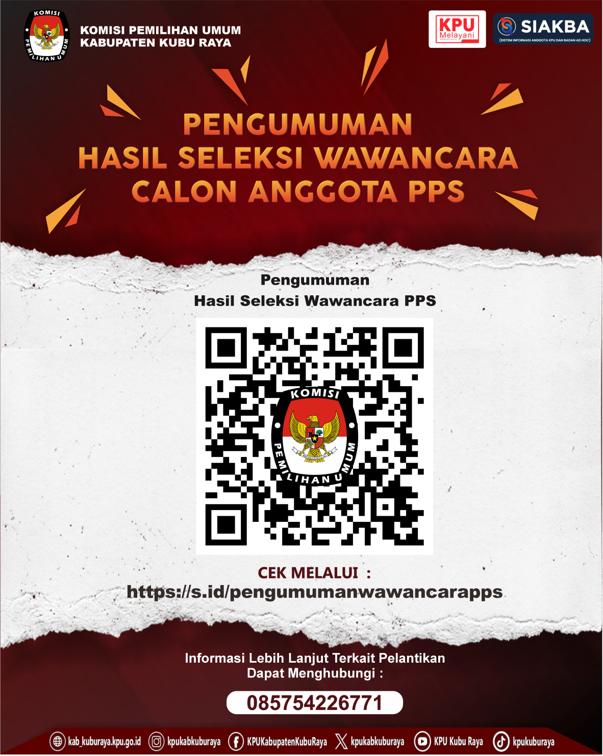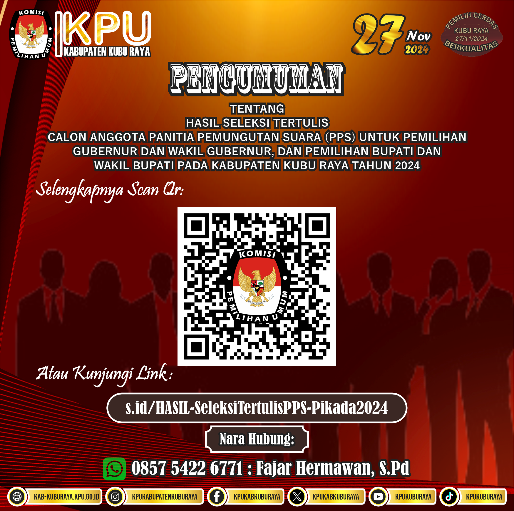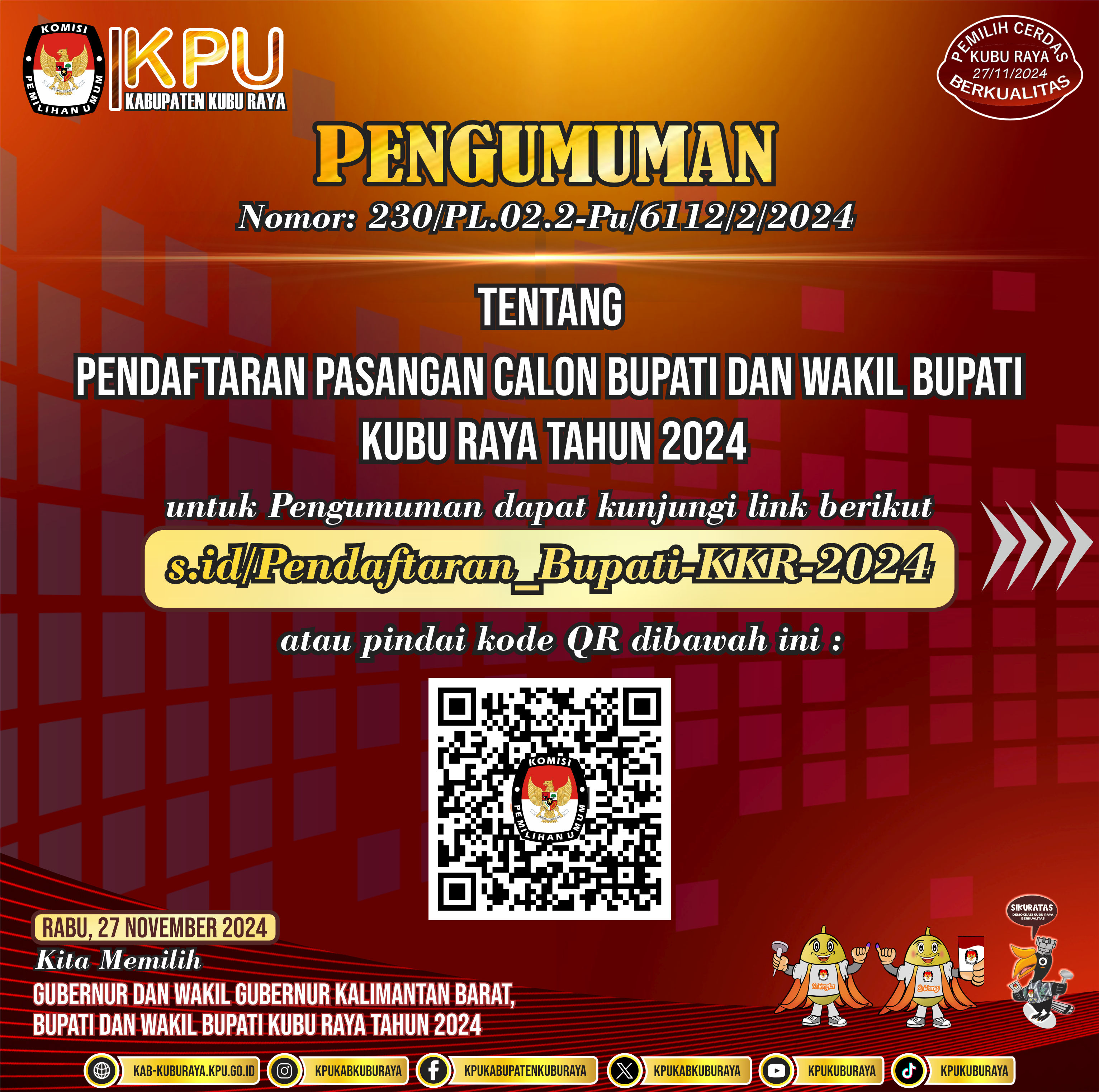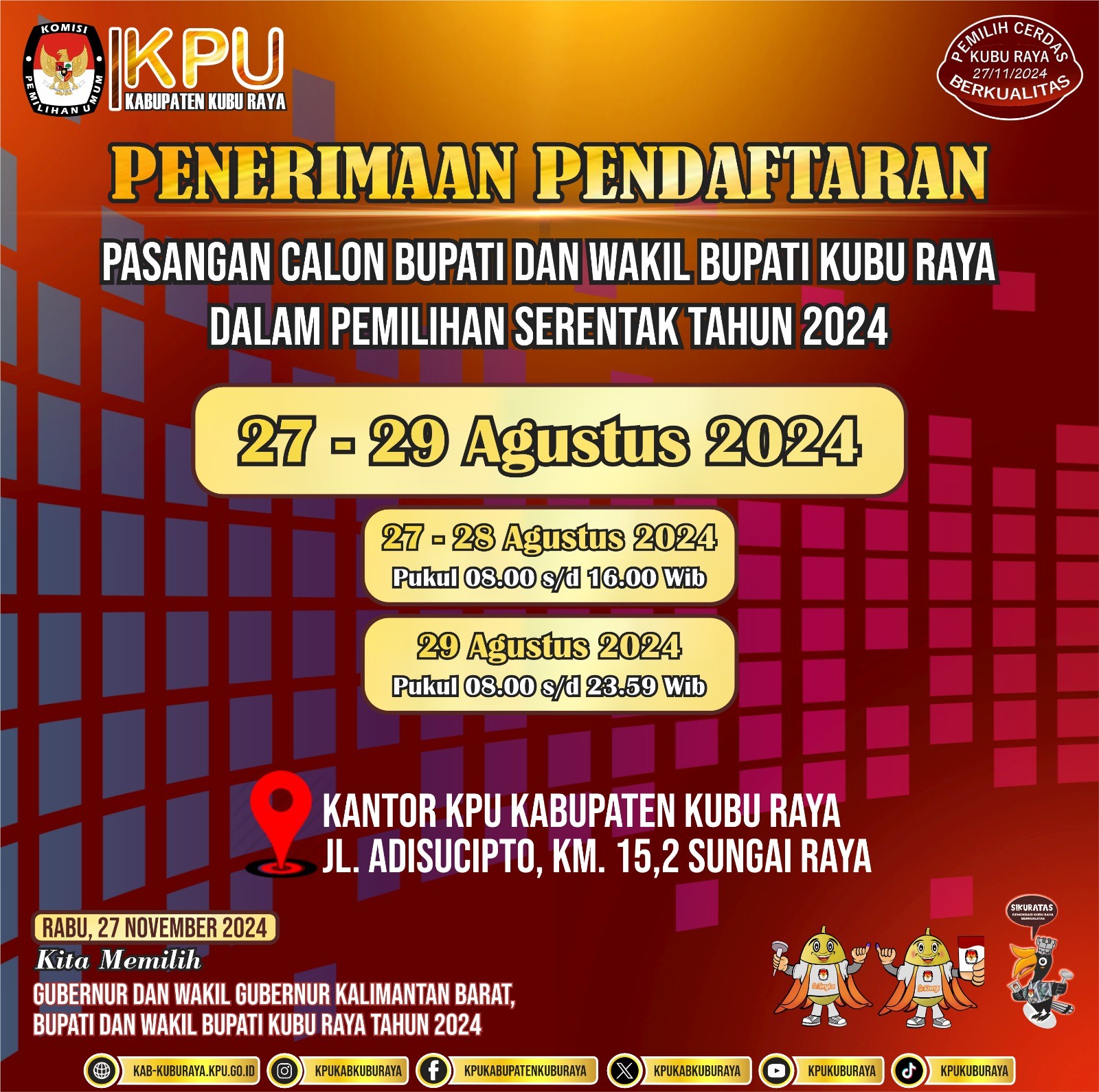 #TemanPemilih, Penerimaan Pendaftaran Pasangan Calon Bupati dan Wakil Bupati Kubu Raya dalam Pemilihan Serentak Tahun 2024 dimulai dari tanggal 27 s/d 29 Agustus 2024.